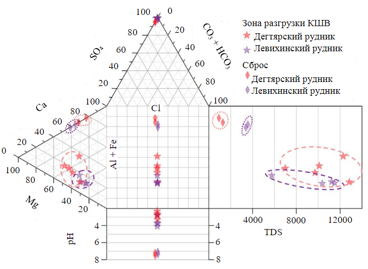 Для оценки эффективности очистки шахтных вод взяты сопоставительные даты – 10 лет после остановки водоотлива – 2003-2004 гг. на Дегтярском, 2015-2016 гг. и Левихинском рудниках. Шахтные воды на Дегтярском руднике в зоне разгрузки (здесь в провале карьера шахты «Колчеданная» сформировался техногенный водоем) характеризуются как кислые (рН = 2,3-3,3), Еh = 263 мВ, по анионному составу сульфатные, по катионному алюминиево-железо-кальциево-магниевые (порядок катионов не постоянен), минерализация М варьируется от 1,4 до 16 г/л (табл.1, 2, рис.3). На Левихинском руднике в зоне разгрузки (в техногенном водоеме в провале шахты «Левиха II») воды менее кислые (рН = 3,6-3,9), Еh = 188 мВ, по составу сульфатные кальциево-магниево-железо-алюминиевые (соотношение катионов может меняться), с минерализацией от 14,2 до 20,0 г/л.