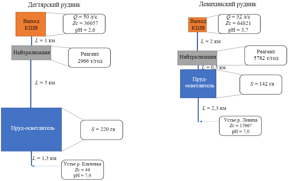Очистка КШВ на рассматриваемых объектах осуществляется в два этапа: нейтрализация известковым молоком и отстаивание в прудах-осветлителях. Эффективность очистки шахтных вод на Дегтярском руднике достигает 99 % для основных загрязняющих веществ. На Левихинском руднике применяется в целом такая же схема очистки, однако она оказывается гораздо менее эффективной – от 59 % для марганца до 93 % для железа и меди.