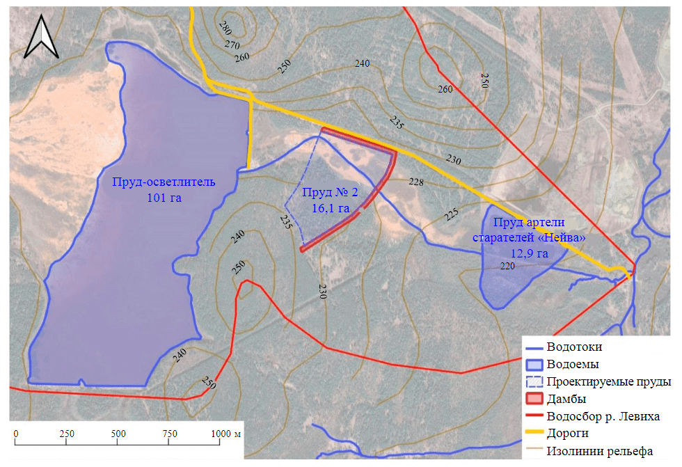 Эксплуатации для пассивной очистки только существующего пруда-осветлителя артели старателей «Нейва» недостаточно из-за его небольшой площади (12.9 га). Для полноценной пассивной очистки площадь прудов, рассчитанная по формуле (4), составляет 18 га. Целесообразно использовать пруд старателей «Нейва» и еще дополнить одним прудом-осветлителем площадью 16,1 га, которые в совокупности будут обеспечивать осаждение металлов вследствие снижения скорости течения воды и увеличения времени взаимодействия загрязняющих веществ с реагентами.
