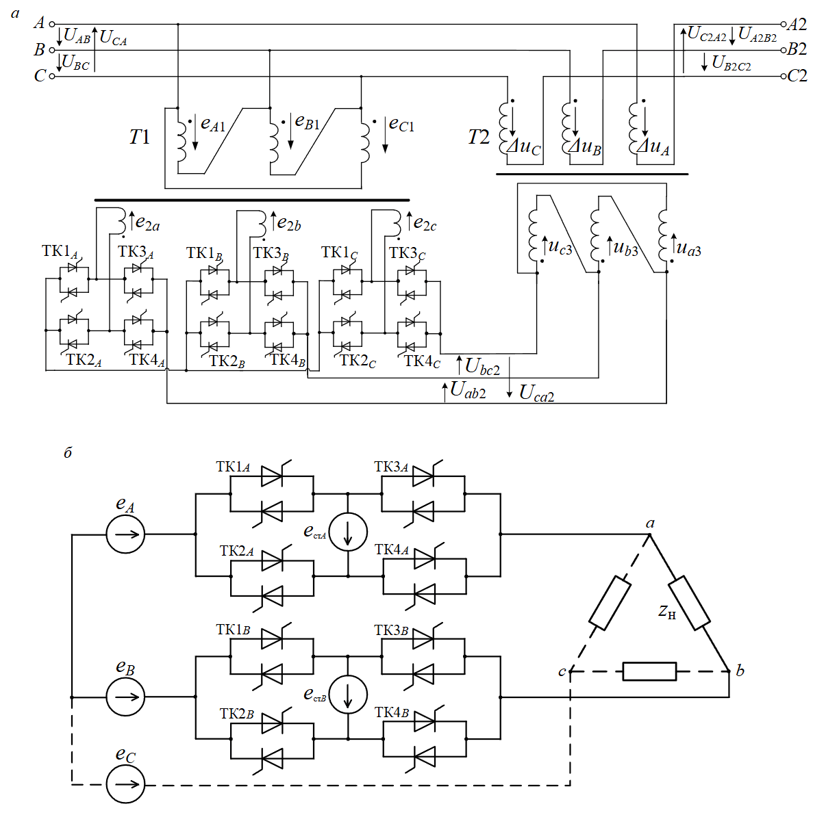 В состав ТВДУ входят трехфазный тиристорный коммутатор, трехфазные шунтовый Т1 и сериесный Т2 трансформаторы. Каждая фаза тиристорного коммутатора является мостовым преобразователем с двунаправленными ключами ТК1-ТК4 в каждом плече (рис.1, а). Принцип действия ТВДУ основан на введении добавочного напряжения при изменении амплитуды выходного напряжения устройства относительно входного.
