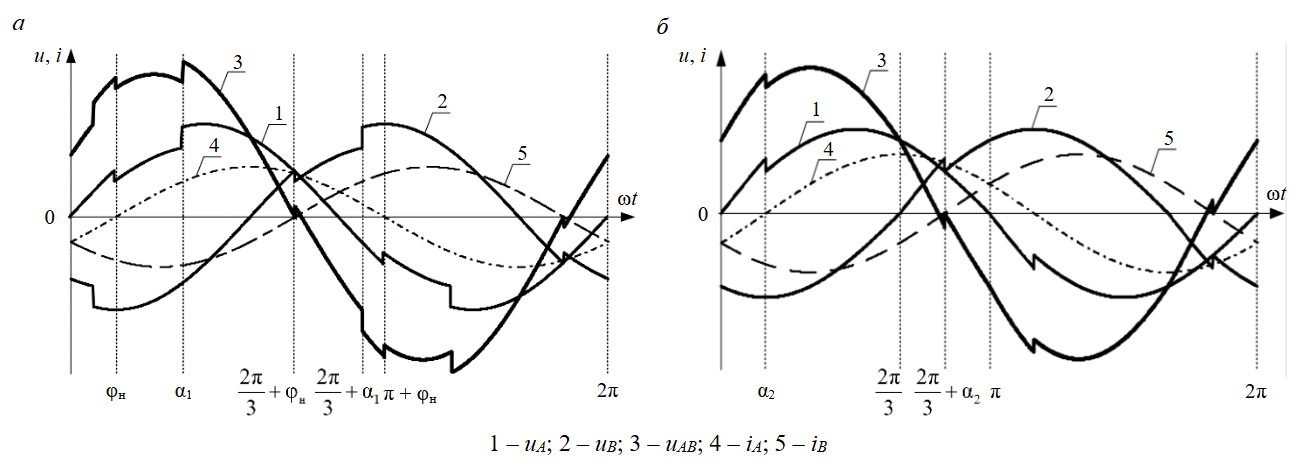 Изменения линейного напряжения нагрузки, согласно [35], в течение полупериода разбиваются на интервалы: от φн до α2; от α2 до ; от до ; от до π + φн.