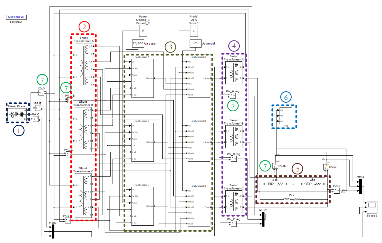 В состав имитационной модели входят семь основных блоков: источник питания (трехфазный источник напряжения); три однофазных шунтовых трансформатора; три однофазных модуля продольного регулирования ТВДУ; три однофазных сериесных трансформатора; трехфазная электрическая нагрузка; измерительные приборы (осциллограф, амперметры и вольтметры); трехфазный измерительный блок параметров линейных напряжений на выходе ТВДУ.