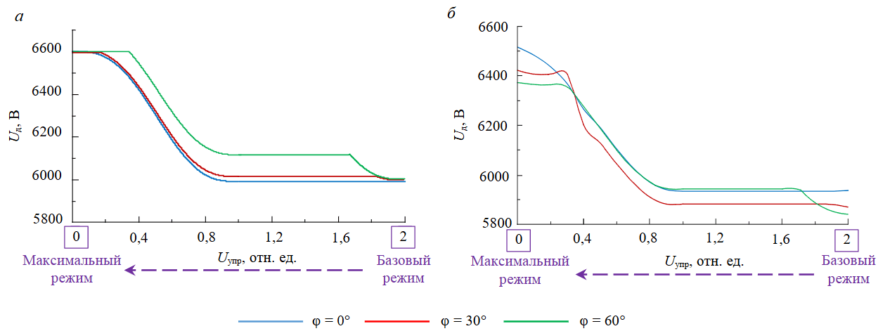 Анализ графиков, полученных при имитационном моделировании, показал, что в режиме повышения напряжения добавка напряжения составляет 551 В (9,4 %). В режиме понижения выходного напряжения амплитуда действующего значения выходного напряжения снижается на 590 В (т.е. на 10 %). В обоих режимах влияние на характер изменения регулировочных характеристик ТВДУ оказывает угол нагрузки.