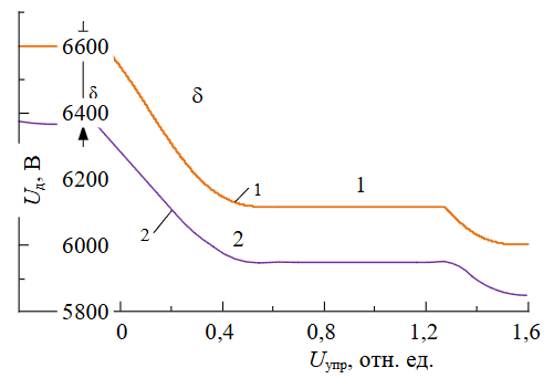 Сравнение регулировочных характеристик ТВДУ, полученных с помощью математического и компьютерного моделирования, показало совпадение их характера и формы (рис.5). Зависимости, полученные на имитационной модели, располагаются ниже, чем при математическом моделировании. Это объясняется учетом падения напряжения в линии питающей сети и на силовых элементах ТВДУ, а также учетом коммутационных интервалов, на которых добавленное напряжение равно нулю. Наибольшее отклонение характеристик δ наблюдается для режима 1 при φ = 60° и составляет 3,5 %.