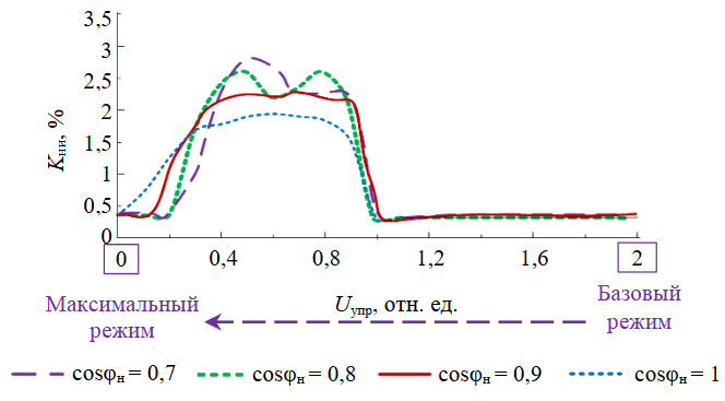 При импульсно-фазовом способе управления тиристорами ТВДУ в электрическую сеть генерируются нечетные гармоники, значения которых не превышают допустимых пределов. Имитационное моделирование позволило получить графики изменения коэффициента нелинейных искажений Kни выходного напряжения ТВДУ в режимах 1 и 3. Пример графика изменения Kни выходного напряжения ТВДУ в режиме 1 при различных коэффициентах мощности нагрузки (cosφн) показан на рис.6.
