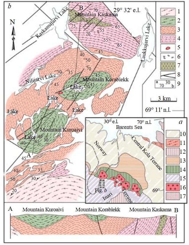 1 – tonalite gneisses; 2-4 – supracrustal complex of the Kaskama Formation (2 – upper, 3 – middle and 4 – lower strata); 5 – plagiomicrocline granites; 6 – metagabbro; 7 – metaultramafic dikes; 8 – faults; 9 – structural elements (а – layering, b – gneissic banding); 10 – Central Kola Terrane; 11 – Murmansk Terrane; 12 – Lapland Granulite Belt; 13 – North Pechenga zone; 14 – South Pechenga zone; 15 – Inari Terrane; 16 – tonalite and plagiogranite intrusions; 17 – Vendian deposits
