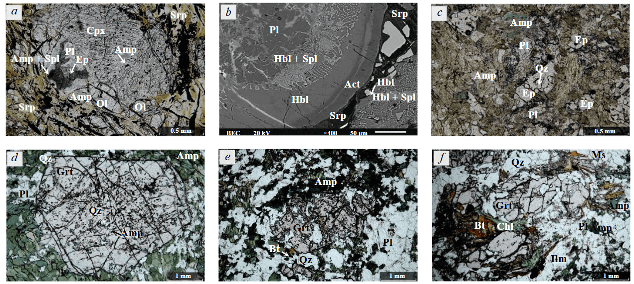Mineral geothermometers. We used for Ol-Cpx thermometry equation [12], based on Fe-Mg exchange between augite and olivine; for Cpx-Ol-Spl thermometry – the equation developed for spinel peridotites [13]; for Ol-Spl thermometry – the equilibrium equation by [14]; for the paragenesis of two pyroxenes geothermometers [15, 16]; for the paragenesis of amphibole with plagioclase – the geothermometer by T.Holland and R.Blandy [17]; for the paragenesis of garnet and amphibole – several thermometric tools, calibrations of which are given in [18-21]; for the paragenesis of garnet and biotite – a thermometer [22].