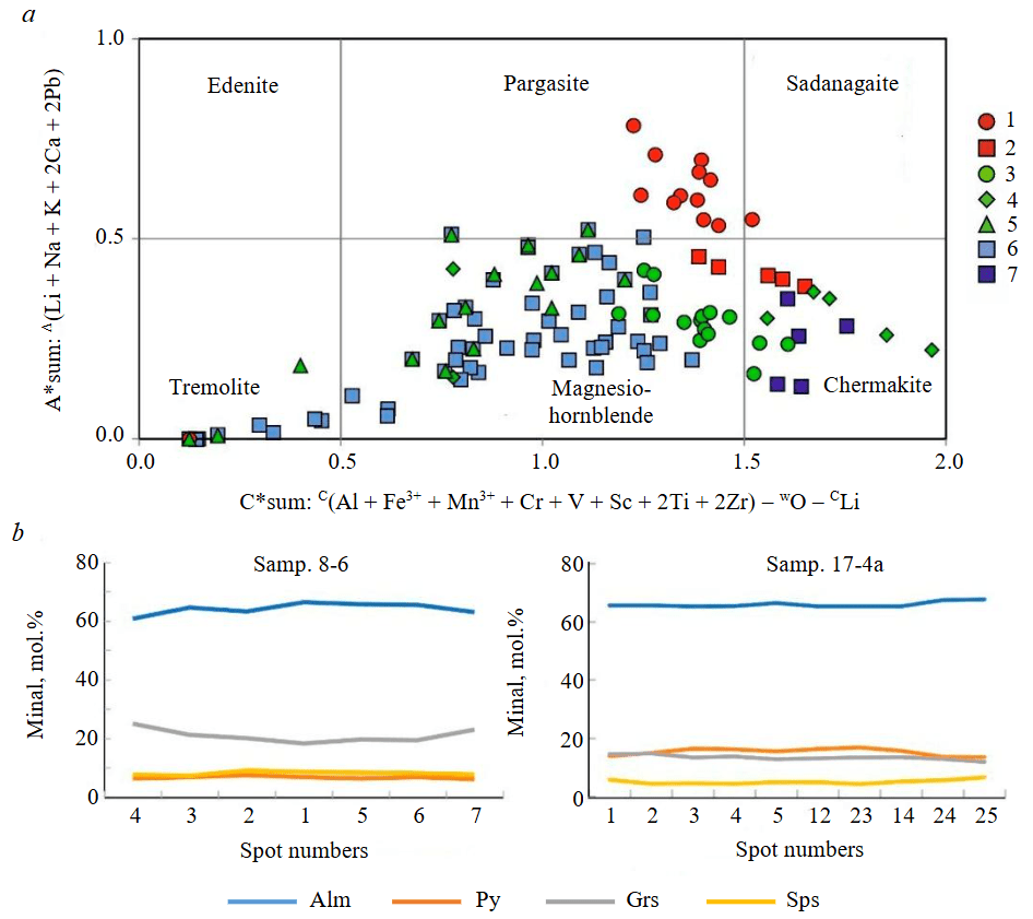 The thermobarometry results are consistent with the observed mineral parageneses in rocks of the Kaskam structure of both the magmatic and metamorphic stages. It should be noted that in recent years the success of using thermobarometric tools to assess the conditions of formation of mineral parageneses in both magmatic [37-40] and metamorphic has been repeatedly demonstrated [41-46].