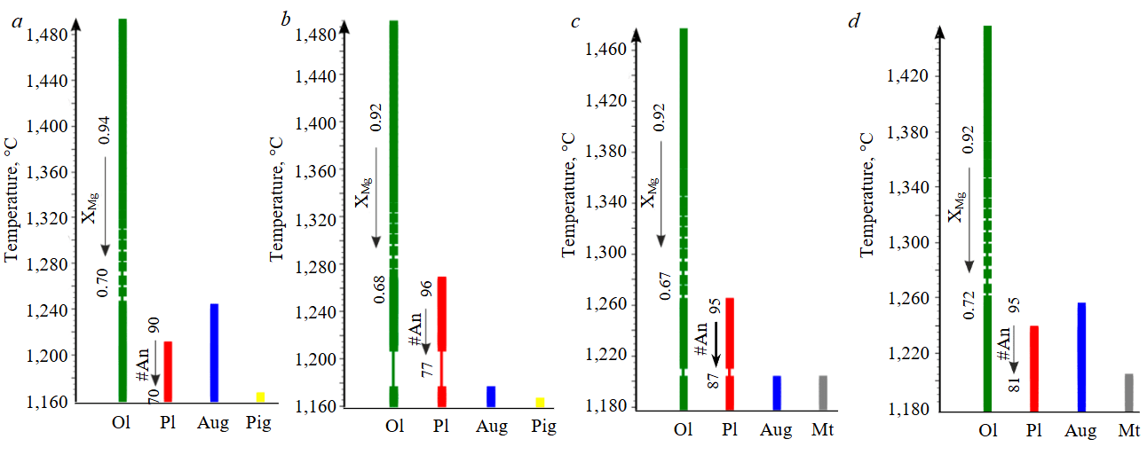 The order of crystallization of minerals was determined in a rock of peridotite composition together with an estimate of liquidus temperatures for olivine, pyroxenes, plagioclase and magnetite were determined together with the estimations according to the equations of mineral-melt system based on COMAGMAT 3.73 software package[32].