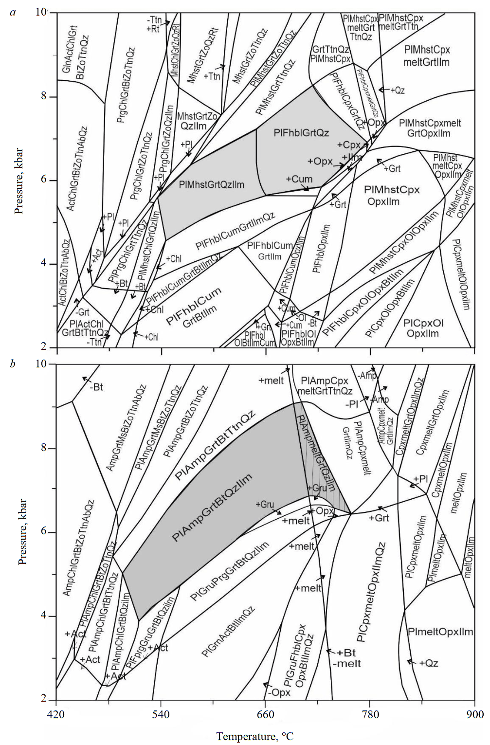 Calculation of stability fields of mineral paragenesis was performed using the Perple_X v.6.9.1 [28] with updates up to 2022. In calculations we used the thermodynamic database hp62ver [29] for minerals and solid solutions of clinoamphibole cAmph(G), orthoamphibole oAmph(DP), clinopyroxene Omph(GHP), olivine O(HP), talc T, biotite Bio(TCC), feldspars, chlorite Chl(W), garnet Gt(W), spinel Sp(WPC), orthopyroxene Opx(W), white mica Mica(CHA), chloritoid Ctd(W), staurolite St(W), ilmenite Ilm(WPH) in the MnTiNCKFMASH-CO2 system (MnO-TiO2-Na2O-CaO-K2O-FeO-MgO-Al2O3-SiO2-H2O), as well as the model of silicate melt(G) [30, 31].
