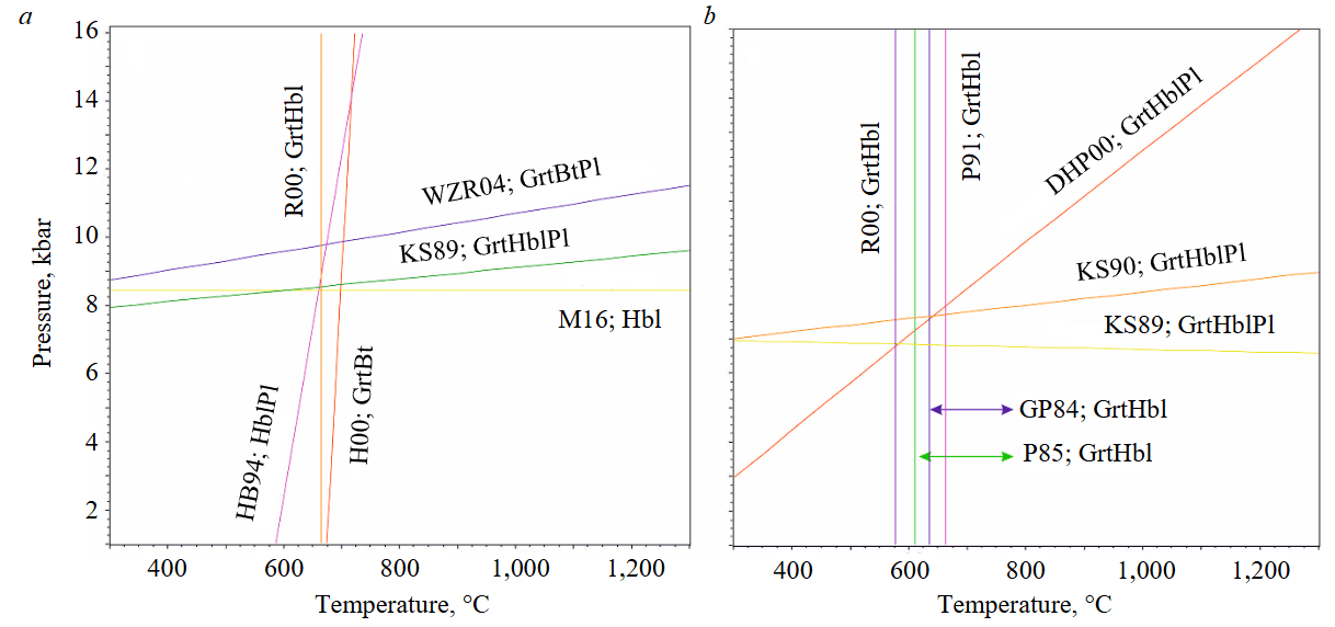 Fig.6. PT-diagrams with the results of calculation of metamorphism parameters of the studied schists: а – samp. 17-4а (migmatized garnet-amphibole-plagioclase schist); b – samp. 8-6 (amphibole-plagioclase schist). Calculation lines for mineral thermometers and barometers correspond to: GP84 [18], P85 [19], KS89 [24], KS90 [25], P91 [20], HB94 [17], H00 [22], DHP00 [26], R00 [21], WZR04 [27], M16 [23]