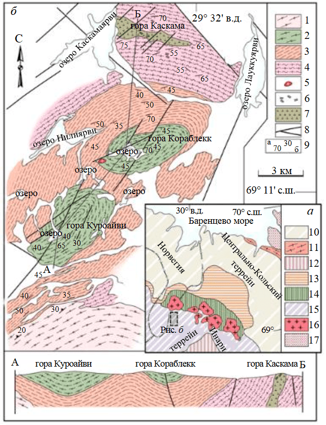 На территории России террейн Инари, который пространственно соответствует ранее выделенному Каскамскому блоку (блок-антиклинорий) [2, 6], граничит на юго-западе с Лоттинско-Сальнотундровским блоком Лапландского гранулитового пояса, а на северо-востоке граница проходит вдоль вулканогенно-осадочных комплексов Южно-Печенгской зоны. Террейн Инари пространственно во многом совпадает с Печенгско-Аллареченским рудным районом [7], что определяет актуальность его исследования в металлогеническом аспекте.