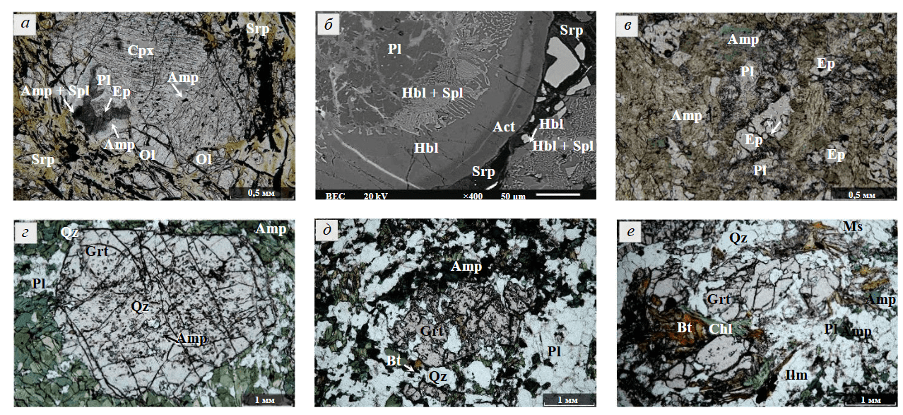 Минеральные геотермометры. Для Ol-Cpx термометрии использовалось уравнение [12], основанное на Fe-Mg обмене между авгитом и оливином; для Cpx-Ol-Spl термометрии применялось уравнение, разработанное для шинелевых перидотитов [13]; для Ol-Spl термометрии использовалось уравнение равновесия по [14]; для парагенезиса двух пироксенов применялись геотермометры [15, 16]; для парагенезиса амфибола с плагиоклазом использован геотермометр Т.Холланда и Р.Бланди [17]; для парагенезиса граната и амфибола использованы несколько термометрических инструментов, калибровки которых даны в работах [18-21]; для парагенезиса граната и биотита применялся термометр [22].