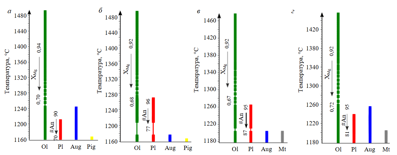 Порядок кристаллизации минералов определялся в породе перидотитового состава вместе с оценкой ликвидусных температур для оливина, пироксенов, плагиоклаза и магнетита по уравнениям геотермометров, откалиброванных для систем минерал-расплав программного комплекса COMAGMAT 3.73 [32].