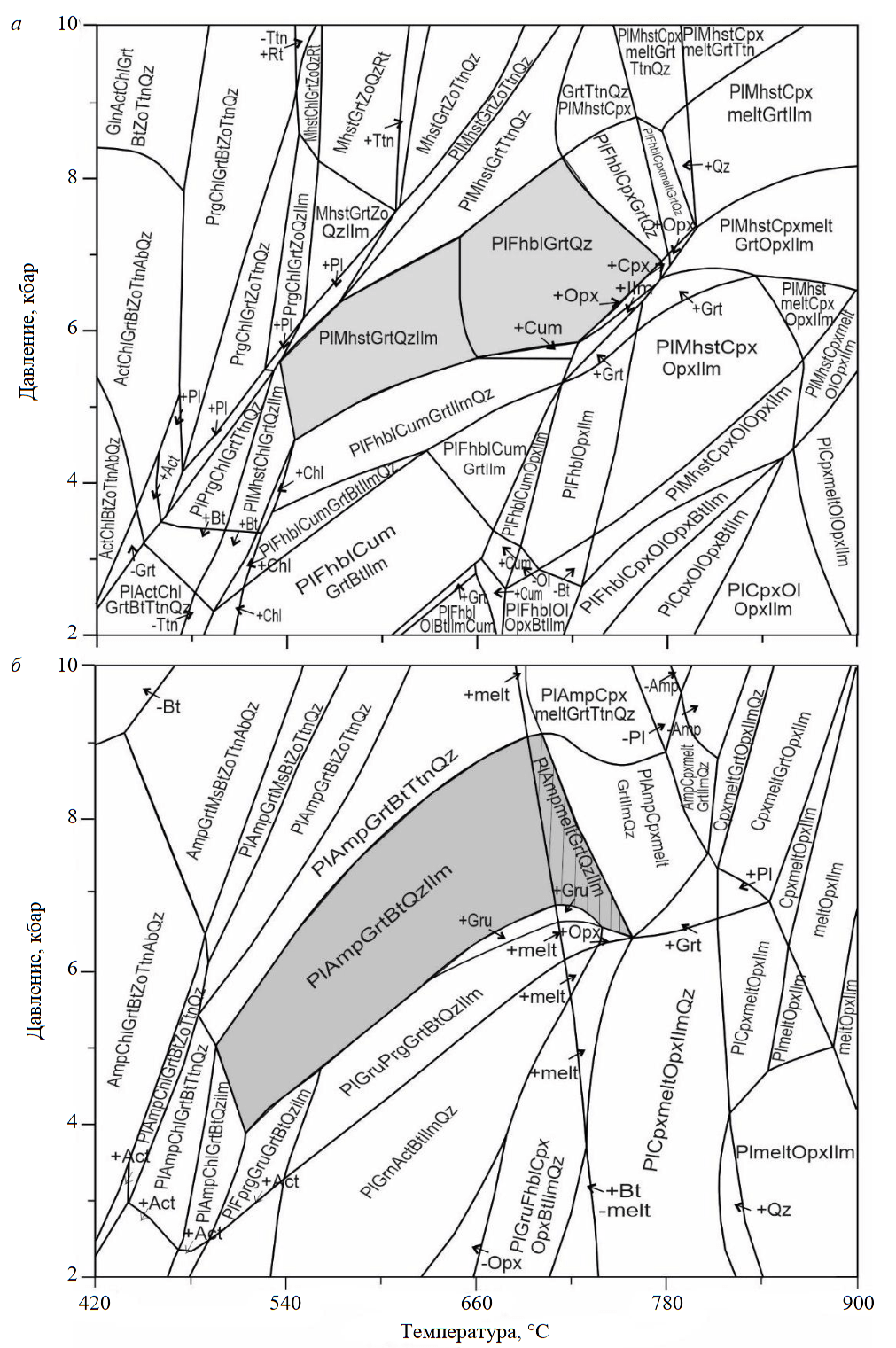 Расчет полей устойчивости минеральных парагенезисов выполнялся с помощью программы Perple_X v.6.9.1 [28] с обновлениями до 2022 г. В расчетах использовалась база термодинамических данных hp62ver [29] для минералов и твердых растворов клиноамфибола cAmph(G), ортоамфибола oAmph(DP), клинопироксена Omph(GHP), оливина O(HP), талька T, биотита Bio(TCC), полевых шпатов (feldspar), хлорита Chl(W), граната Gt(W), шпинели Sp(WPC), ортопироксена Opx(W), белых слюд Mica(CHA), хлоритоида Ctd(W), ставролита St(W), ильменита Ilm(WPH) в системе MnTiNCKFMASH-CO2 (MnO-TiO2-Na2O-CaO-K2O-FeO-MgO-Al2O3-SiO2-H2O), а также модель силикатного расплава melt(G) [30, 31].