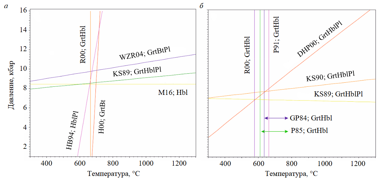 Минеральные геобарометры –мономинеральный амфиболовый [23], гранат-амфибол-плагиоклазовый [24-26], гранат-биотит-плагиоклазовый для кварцсодержащих пород [27].