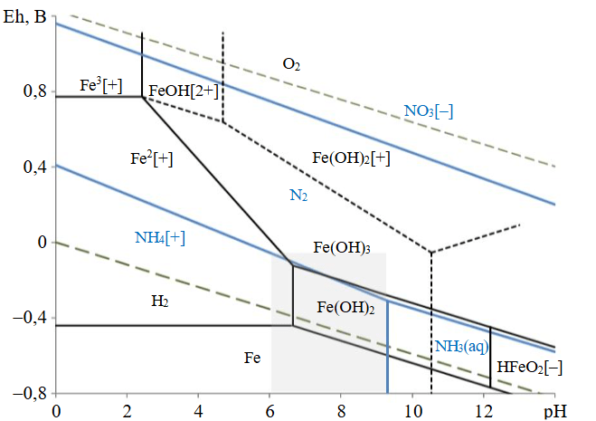 В представленном исследовании показана возможность очистки нейтральных и слабощелочных карьерных вод от нитрат-ионов гальванопарой Fe0-C. На основании проведенного термодинамического анализа процессов восстановления нитрат-ионов редокс-системой Fe0-C установлены наиболее вероятные реакции и основные продукты восстановления. Показано, что в нейтральной среде возможно протекание реакций с образованием ионов аммония и газообразного азота, при этом реакции, протекающие с образованием газообразного азота, термодинамически наиболее вероятны.
