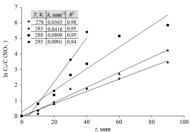 В статическом режиме в реакционных сосудах исследовались кинетические закономерности процесса редукции нитрат-ионов. Модельные растворы карьерных вод объемом 1 дм3 с рН 7,0 при постоянном перемешивании обрабатывались гальванопарой Fe0-C при температурах 278, 283, 288 и 293 K. Масса гальванопары составляла 5 г, массовое соотношение Fe0-C 2:1. Для построения кинетической кривой определяли содержание нитрат-ионов в пробах через заданные промежутки времени – от 10 до 90 мин. Концентрация нитрат-ионов в растворах составляла 88,1±18,0 мгN/дм3.