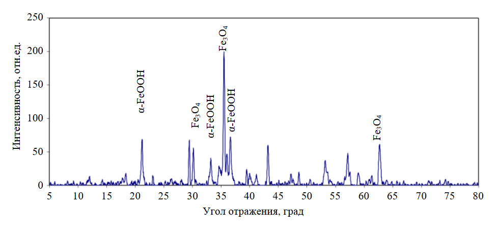 В образце идентифицированы гетит α-FeOOH (межплоскостные расстояния, Å: 4,18095 (21,2°); 2,69207 (33,23°); 2,44935 (36,7°) и магнетит Fe3O4 (межплоскостные расстояния, Å: 2,95759 (30,2°); 2,5239 (35,5°); 2,09152 (43,2°); 1,47991 (62,7°).