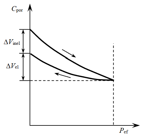 The values ​​of the approximating function are used in subsequent estimations. The change in the pore compressibility coefficient is determined based on the data set of changes in Vpor against Pef in the cycle: