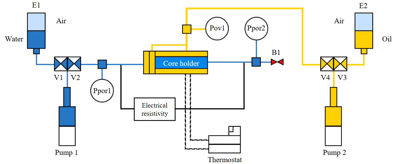 At the end of filtration, the pressures are set as follows: pore Ppor, equal to the formation pressure, and initial overburden Pov 2 MPa higher. Temperature and electrical resistance become stable at these values.
