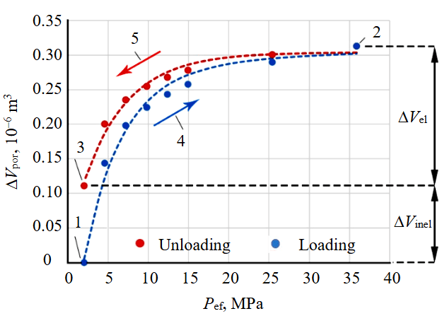 Figure 3 shows the dynamics of Vpor change as a result of the effective pressure action cycle from 2 to 35.9 MPa. During loading, the effective pressure increases, the sample is compressed, and its pore volume decreases. The pore line pump operates in the pressure holding mode at 22.9 MPa. A decrease in Vpor provokes pressure increase in the pore line, which is recorded by the sensors and compensated by the pump. The volume of liquid pumped out by the pump to compensate for the pressure characterizes the changes in the pore volume ΔVpor. This process is shown by blue dots 1 through 2 (Fig.3), the latter corresponding to the maximum effective pressure of 35.9 MPa. Arrow 4 indicates an increase in ΔVpor, which is caused by elastic and inelastic deformations of the pore space. The difference in values ​​between points 1 and 2 corresponds to the total change in pore volume, equal to the sum of the changes in volume due to elastic and inelastic deformations of the pores: