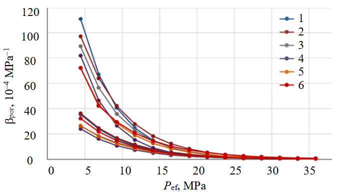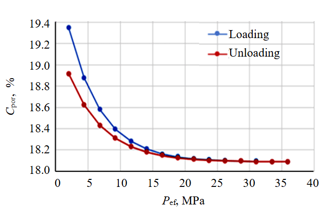 There are different methods for determining the volume compression of rocks caused by changes in the stress state. For example, [7] gives the integral and differential approaches. The influence of the pore type on compressibility with a change in effective stress is given in [24, 25]. The prediction of pore compressibility using an empirical relationship based on the total effective stress and initial porosity is shown in [19]. The analysis of a large number of rock tests in [6, 19] reduced the random error to a minimum and made it possible to determine that the maximum compressibility coefficient is observed at low porosity values.