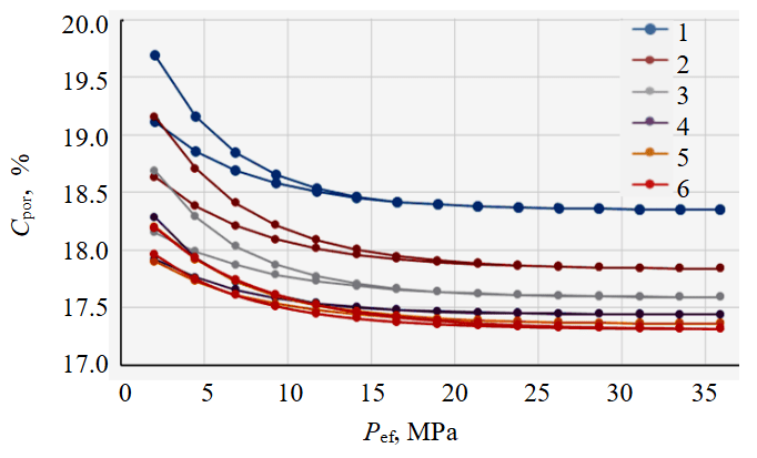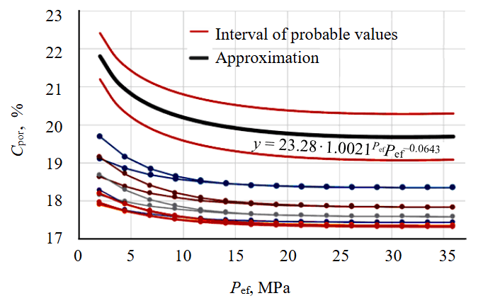 The obtained approximation data allow us to plot a graph of the Cpor dependence of the studied samples in the created P-T conditions on the applied Pef at each cycle.