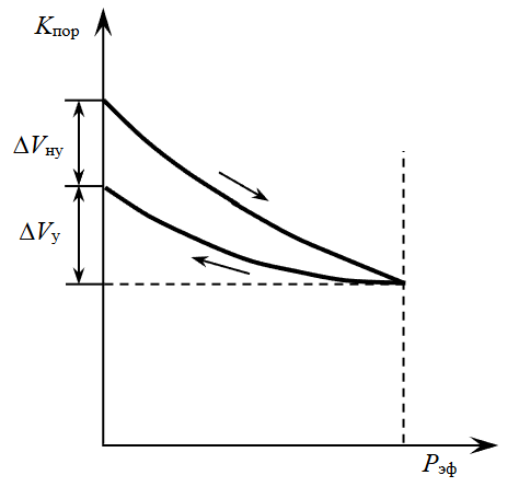 Рис.1. Влияние деформаций при цикле нагрузки на коэффициент открытой пористости породы Kпор; ∆Vу и ∆Vну – упругая и неупругая деформации пор в образце