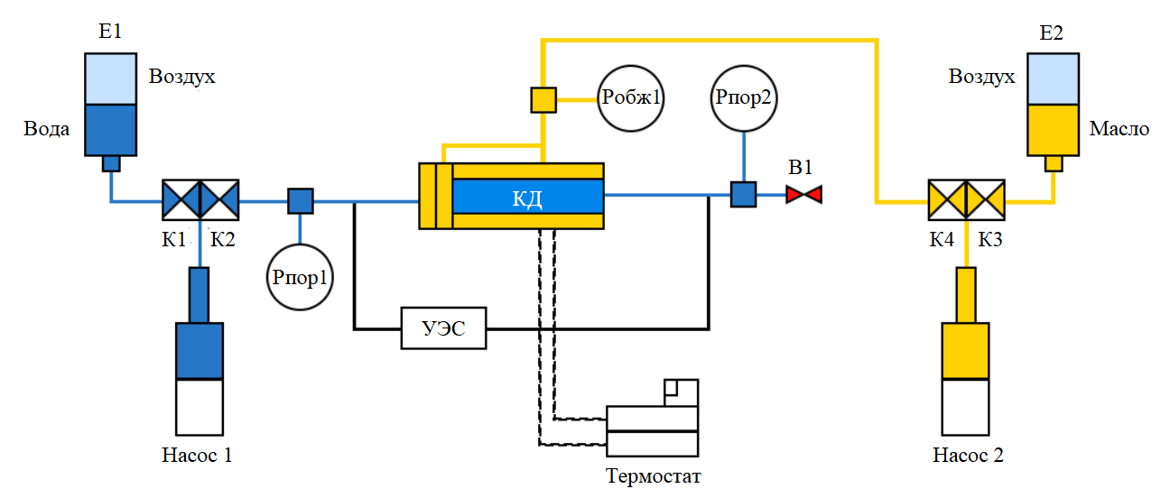 Для создания условий нагрузки и разгрузки при ТБУ используется специализированное технологическое оборудование. Основной принцип работы установки заключается в измерении объема вытесненного флюида из порового пространства горной породы при созданных моделирующих давлениях. Исследуемые образцы обязательно должны быть полностью насыщены флюидом. Установка представляет собой пневмогидравлическую систему из двух ветвей (рис.2), управляемых пневматическими клапанами К1-4. Левая посредством насыщающего флюида формирует в образце поровое давление, измеряемое преобразователем Рпор1. Измеритель Рпор2 позволяет определить поровое давление на выходе из образца для замера проницаемости. Правая ветвь оперирует гидравлическим маслом, создавая давление обжима, измеряемое преобразователем давления Робж1. Давление обжима в равной мере оказывает воздействие на боковую поверхность образца породы через резиновую манжету и создает осевую нагрузку посредством гидроцилиндра, расположенного в торце кернодержателя (КД).