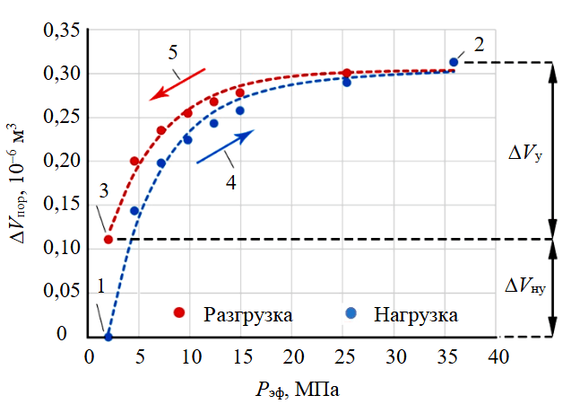 На рис.3 приведена динамика изменения Vпор в результате цикла воздействия эффективного давления от 2 до 35,9 МПа. В ходе нагрузки растет эффективное давление, образец сжимается, снижается его поровый объем. Насос поровой линии работает в режиме удержания давления на значении 22,9 МПа. Снижение Vпор провоцирует рост давления в поровой линии, что фиксируется датчиками и компенсируется насосом. Объем жидкости, откачанной насосом для компенсации давления, характеризует изменения объема пор ΔVпор. Этот процесс отображен синими точками с 1 по 2 (рис.3), последняя соответствует максимальному эффективному давлению 35,9 МПа. Стрелка 4 указывает рост ΔVпор, который вызван упругими и неупругими деформациями порового пространства. Разница значений между точками 1 и 2 соответствует полному изменению объема пор, равному сумме изменений объемов за счет упругих и неупругих деформаций пор: