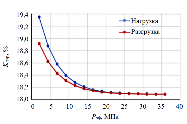 На рис.4 как пример приведены кривые нагрузки и разгрузки для первого цикла образца 95. В рамках кривых одного цикла видно, что основное изменение объема пор происходит до Pэф = 15 МПа, далее кривая становится пологой и параметр мало меняется от давления. Произошедшие пластические деформации наглядно показывают расхождение кривых нагрузки и разгрузки на рис.4. Пористость в образце после цикла при замере в атмосферных условиях уменьшилась на 0,44 % абсолютного значения, притом в ходе самого цикла пористость снизилась на 1,26 %. Подобный анализ справедлив для нагружений и других образцов рассматриваемой литологической группы. Сделанные выводы совпадают с рядом экспериментов, проведенных В.М.Добрыниным [28], А.Т.Карманским [29], В.С.Жуковым [30-32].