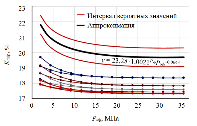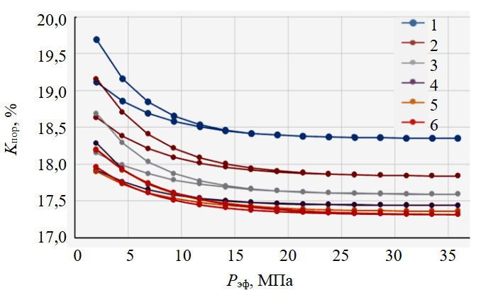Полученные данные аппроксимации позволяют построить график зависимости Kпор исследованных образцов в созданных ТБУ от приложенного Pэф на каждом цикле.
