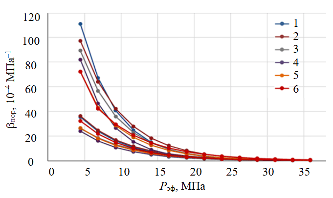 В последующих вычислениях применяются значения аппроксимирующей функции. По набору данных изменения Vпор от Pэф на цикле устанавливается изменение коэффициента сжимаемости пор: