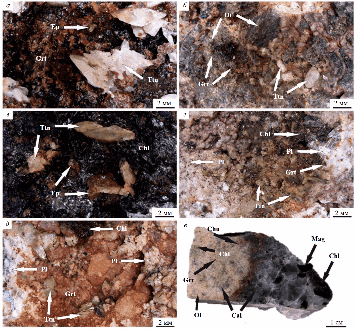 Chl – клинохлор; Di – диопсид; Ep – эпидот; Grt – гранат андрадит-гроссулярового ряда; Pl – плагиоклаз (альбит – олигоклаз – андезин); Ttn – титанит