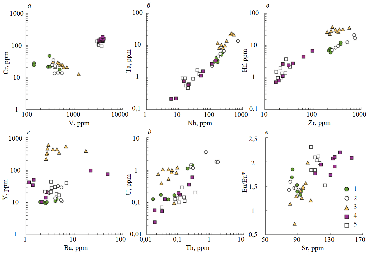 Во всех зернах титанита в разной степени проявлена Eu-аномалия, тогда как значимая Ce-аномалия установлена в единичных анализах титанита из эпидот-титанит-клинохлоровой ассоциации (Николае-Максимилиановская копь). Eu и Cе служат индикаторами окислительно-восстановительных условий [46, 57, 58], однако избыток Eu и, следовательно, положительная Eu-аномалия при контактово-метасоматических и гидротермальных процессах может быть обусловлена наследованием Eu из плагиоклазов в случае развития по ним титанита [47, 59, 60]. Заметная положительная Eu-аномалия в титаните из минеральных агрегатов Прасковье-Евгеньевской копи, возможно, унаследована от плагиоклазов из материнских габбро. Если отрицательная Ce-аномалия для титанита отражает восстановительные условия, то слабая положительная Eu-аномалия при полном отсутствии Ce-аномалии также может быть индикатором восстановительных условий.