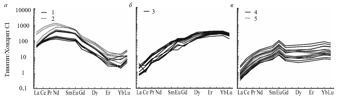 Ранее продемонстрирована важность проведения минералогических [36, 37] и геохимических [38-40] исследований при решении проблем петро-и рудогенеза, а также установлено, что условия генезиса минералов отражаются на характере распределения REE в них [41-43]. Спектры распределения REE для титанита в пределах каждой минералогической копи в принципе соответствуют друг другу, что может свидетельствовать об общности условий их образования в пределах одного объекта, даже несмотря на отличающиеся минеральные ассоциации [44, 45]. Уровень содержания и характер распределения REE в изученных образцах типичен для титанита, образованного в результате гидротермальных процессов [46-48]. Другими особенностями редкоэлементного состава [5, 19, 49] отличается титанит, возникший в результате магматического или метаморфического процесса. Несмотря на это, уровень содержания REE и проявление дифференциации LREE относительно HREE может зависеть как от состава материнской породы, так и последовательности кристаллизации титанита по сравнению с другими минералами [50]. Продемонстрировано обеднение титанита LREE при кристаллизации совместно или после минералов-концентраторов LREE, например эпидота или апатита, и наоборот, обеднение HREE при кристаллизации совместно или после минералов-концентраторов HREE, например граната или циркона [51].