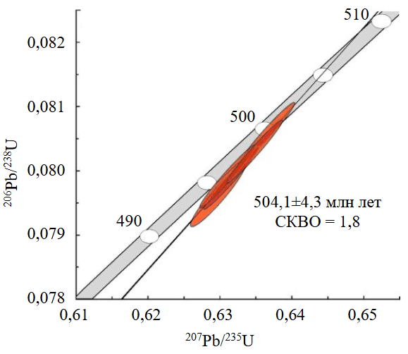 Фигуративные точки гранатов образуют на диаграмме с конкордией компактный субконкордантный кластер (рис.4), через который проведена дискордия (СКВО = 1,8). Нижнее пересечение дискордии с конкордией (16±320 млн лет) является условно нулевым. Верхнее пересечение имеет возрастную отметку 504,1±4,3 млн лет, которую можно рассматривать как время кристаллизации гранатов и, следовательно, образования силикатно-карбонатных пород в пределах Перовскитовой копи.