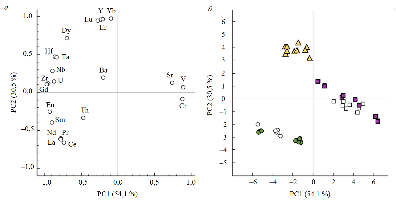 Рис.5. Визуализация данных по распределению элементов-примесей в титаните методом PCA в координатах первой и второй главной компоненты диаграммы нагрузок (а) и значений главной компоненты (б). В скобках в процентах указан вес соответствующей главной компоненты (PC)