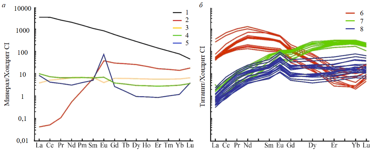 Рис.6. Спектры распределения редкоземельных элементов для различных минералов: а – 1-5 – по усредненным данным из литературных источников: 1 – магматический титанит из пород щелочно-ультраосновных серий Кольской провинции [53], 2 – гранат из скарновых минеральных ассоциаций Ахматовской копи [25], 3 – клинопироксен из метабазита (пояс Лимпопо, Южная Африка) [54], 4 – эпидот из скарнов месторождения Петровица (Болгария) [55], 5 – плагиоклаз из различных габброидов [56]; б – 6-8 – титанит в зависимости от парагенетических и «материнских» минералов: 6 – с гранатом (Ахматовская копь), 7 – с эпидотом (Николае-Максимилиановская копь), 8 – по плагиоклазу и/или пироксену (Прасковье-Евгеньевская копь)