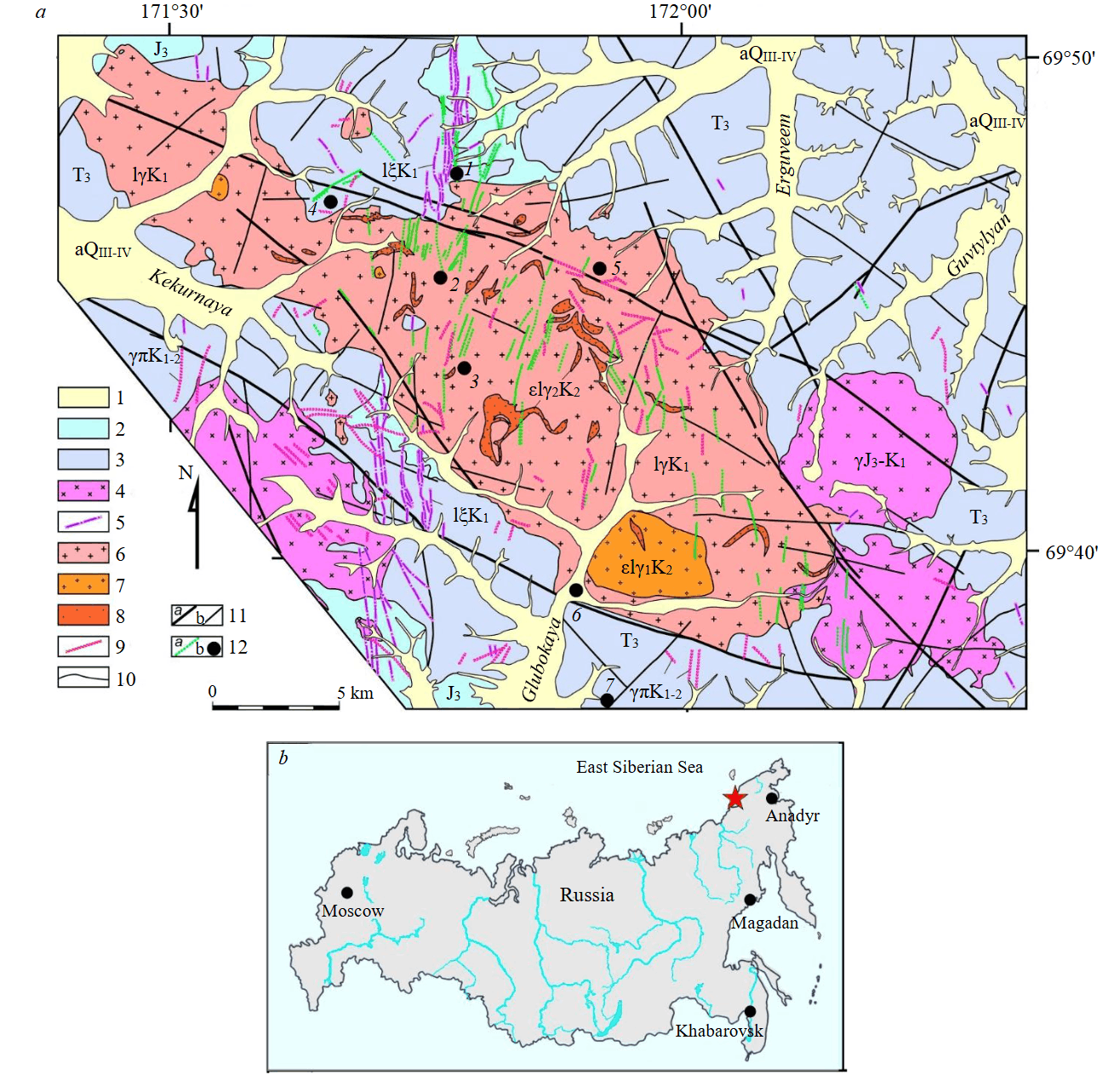 1 – alluvial deposits (aQIII-IV); 2 – tuffaceous sandstones (J3); 3 – terrigenous rocks (T3); 4 – biotite-hornblende granites of the Purginsky complex, γJ3-K1; 5 – porphyritic monzogranite and granosyenite dikes of the Ichuveem complex, γξK1; 6 – undivided leucogranites of the main and additional phases of the Chaun complex, lγK1; 7 – microcline-albite Li-F granites of the first phase of the Pyrkakai complex, εlγ1K2; 8 – microcline-albite Li-F granites of the second phase of the Pyrkakai complex, εlγ2K2; 9 – granite-porphyry dikes, γπK1-2; 10 – geological boundaries; 11 – faults: regional (a), local (b); 12 – undivided greisen and tourmaline metasomatic zones (a), deposits and occurrences (b): 1 – Erguveem, 2 – Kekurnoe, 3 – Stremitelnoe, 4 – Terrassovoe, 5 – Utinoe, 6 – Glubokoe, 7 – Pyrkakai