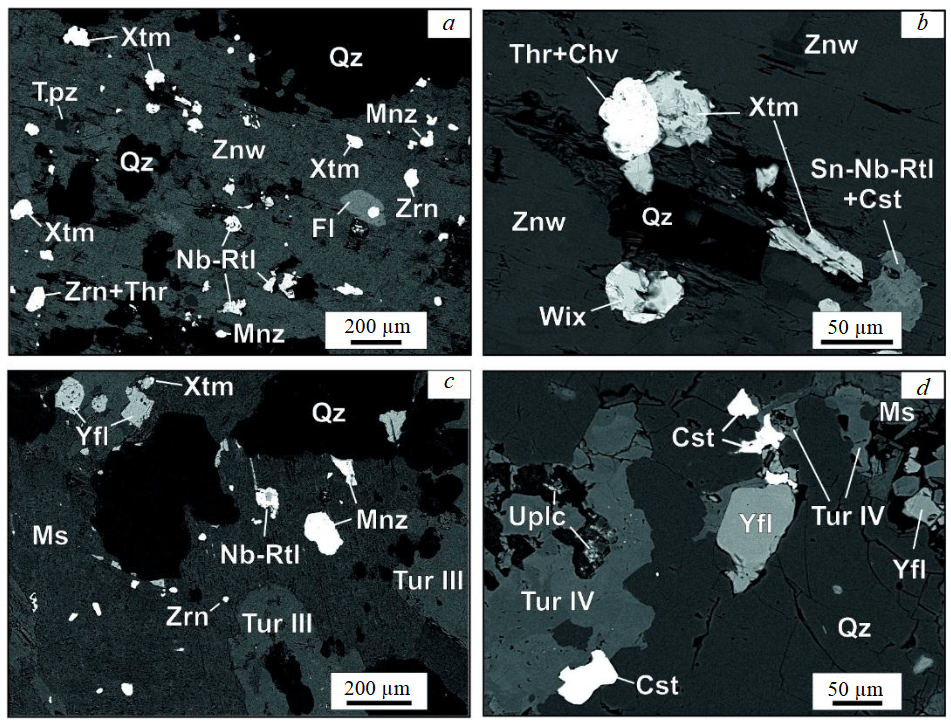 Fig.3. Tin-rare-metal minerals of zwitters and tourmalinites of the Severny pluton (backscattered electron images): a – topaz-quartz-zinnwaldite zwitter with Nb-bearing rutile, xenotime-(Y), monazite-(Ce), Hf-bearing zircon, thorite (Kekurnoe deposit); b – inclusions in zinnwaldite of the zwitter: wolframoixiolite, xenotime-(Y), Nb-W-Sn-bearing rutile, thorite, chernovite-(Y), cassiterite (Kekurnoe); c – quartz-tourmaline-muscovite metasomatite with monazite-(Ce), xenotime-(Y), yttrofluorite, and Hf-zircon (Stremitelnoe); d – cassiterite, uranopolycrase, yttrofluorite in an ore tourmaline-quartz vein (Utinoe)