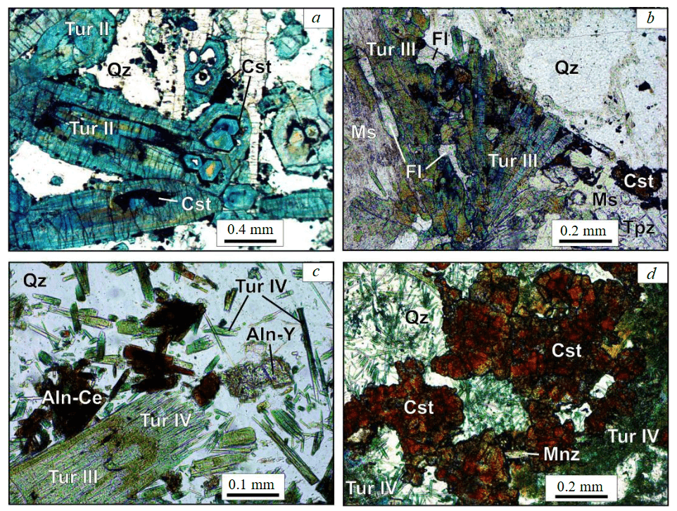Fig.4. Tourmalinites of the Severny pluton (photomicrographs without analyzer): a – tourmaline II with cassiterite inclusions in a pre-ore vein of group 2 (Stremitelnoe occurrence); b – fluorite-muscovite-quartz metasomatite with tourmaline III and cassiterite in an early ore vein of group 3 (Kekurnoe deposit); c – tourmaline III with overgrowth of tourmaline IV in an early ore vein of group 3 with allanite-(Ce), allanite-(Y) (Kekurnoe deposit); d – tourmaline IV, cassiterite, and monazite-(Ce) in an ore vein of group 4 (Kekurnoe deposit)
