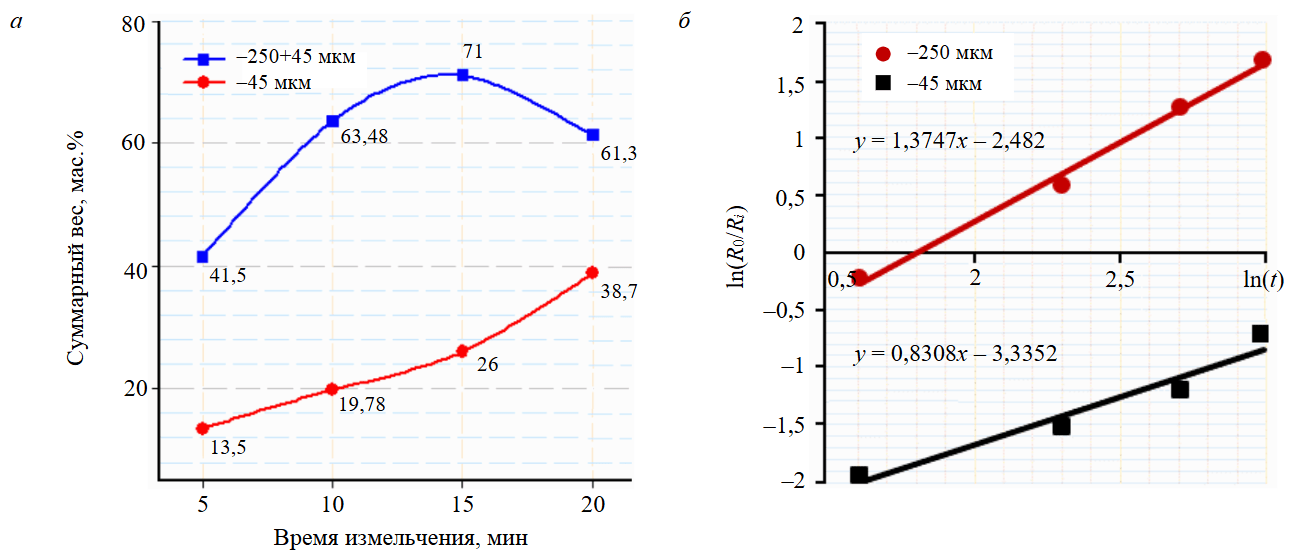 На рис.1, б показана связь между ln(t) и ln(R0/Ri). Как видно из полученных результатов, кинетика измельчения подчиняется уравнению первого порядка – линейной зависимости относительного содержания неизмельченной фракции ln(R0/Ri) от ln(t). На основании результатов исследования кинетики измельчения полевошпатовой руды получены уравнения, описывающие процент выхода фракций –250 мкм, –250+45 мкм и –45 мкм соответственно за разное время: