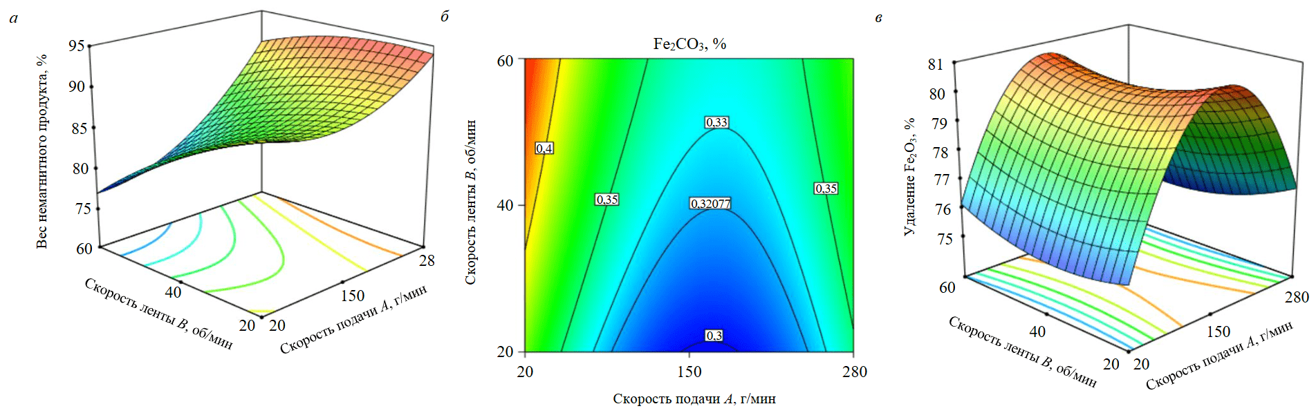 Рис.2. Трехмерная зависимость скорости ленты, скорости подачи и выхода концентрата (а); содержание Fe2O3 в концентрате (б) и трехмерная зависимость удаления Fe2O3 (в)