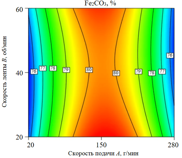 Эффективность обогащения крупнозернистого полевого шпата (–250+45 мкм), полученного после измельчения, а также процент удаления оксида железа были изучены при помощи факторного плана Бокса – Бенкена. Этот план дает представление о взаимодействии различных факторов и общем функционировании системы. Исследованными переменными выступили скорость ленты (от 20 до 60 об/мин) и скорость подачи (от 20 до 280 г/мин). Оптимальные условия были оценены с помощью полиномиальной функции второго порядка для проведения корреляции между изучаемыми переменными и откликами процента выхода концентрата (немагнитная фракция), доли содержания, удаления Fe2O3.