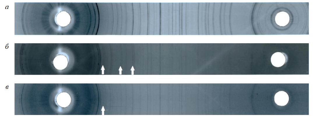 Для определения фазового состава представленные горные породы (кварцит, андезит, песчаник) были исследованы методом рентгеноструктурного анализа. Исследования проводились методом порошков, съемка осуществлялась на рентгеновском аппарате УРС-60 с помощью камеры РКУ (d = 114,6 мм) на фотопленку, излучение анода – Co. Полученные рентгенограммы представлены на рис.1. Все представленные горные породы имеют кристаллическую структуру. Гало, соответствующее аморфной фазе, отсутствует. Опираясь на данные элементного состава, можно предположить, что материал (кварцит) представляет собой SiO2 в чистом виде (рис.1, а). Оценка межплоскостных расстояний по рентгенограмме на рис.1, а и сравнение их с табличными значениями подтвердило, что в кварците преобладает α-кварц. Линии на рентгенограммах рис.1, а совпадают с линиями рентгенограммы на рис.1, б, в, следовательно, материалы из андезита и песчаника также содержат α-кварц в большом количестве, что соответствует результатам элементного состава. Андезит и песчаник содержат дополнительные фазы. Элементный состав показывает, что природные материалы содержат в небольшом количестве доломит (CaCO3∙MgCO3). На рентгенограмме (рис.1, б) прослеживаются три наиболее интенсивные линии межплоскостных расстояний d/n = 2,89; 2,19; 1,80, соответствующие доломиту, на рис.1, в прослеживается одна наиболее интенсивная линия с межплоскостным расстоянием d/n = 2,89, соответствующая доломиту (отмечена стрелкой).