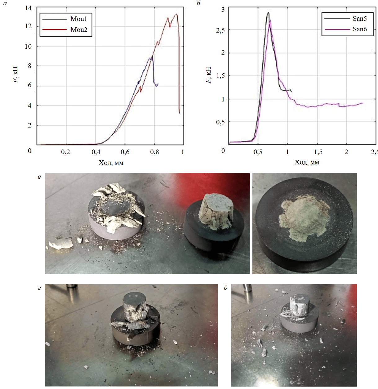 Рис.2. Зависимости приложенной силы от хода верхней траверсы испытательной машины Shimadzu AG-X plus для образцов андезита (а) и песчаника (б) и внешний вид образцов песчаника San6 (в) и андезита Mou1 (г), Mou2 (д) после квазистатического сжатия