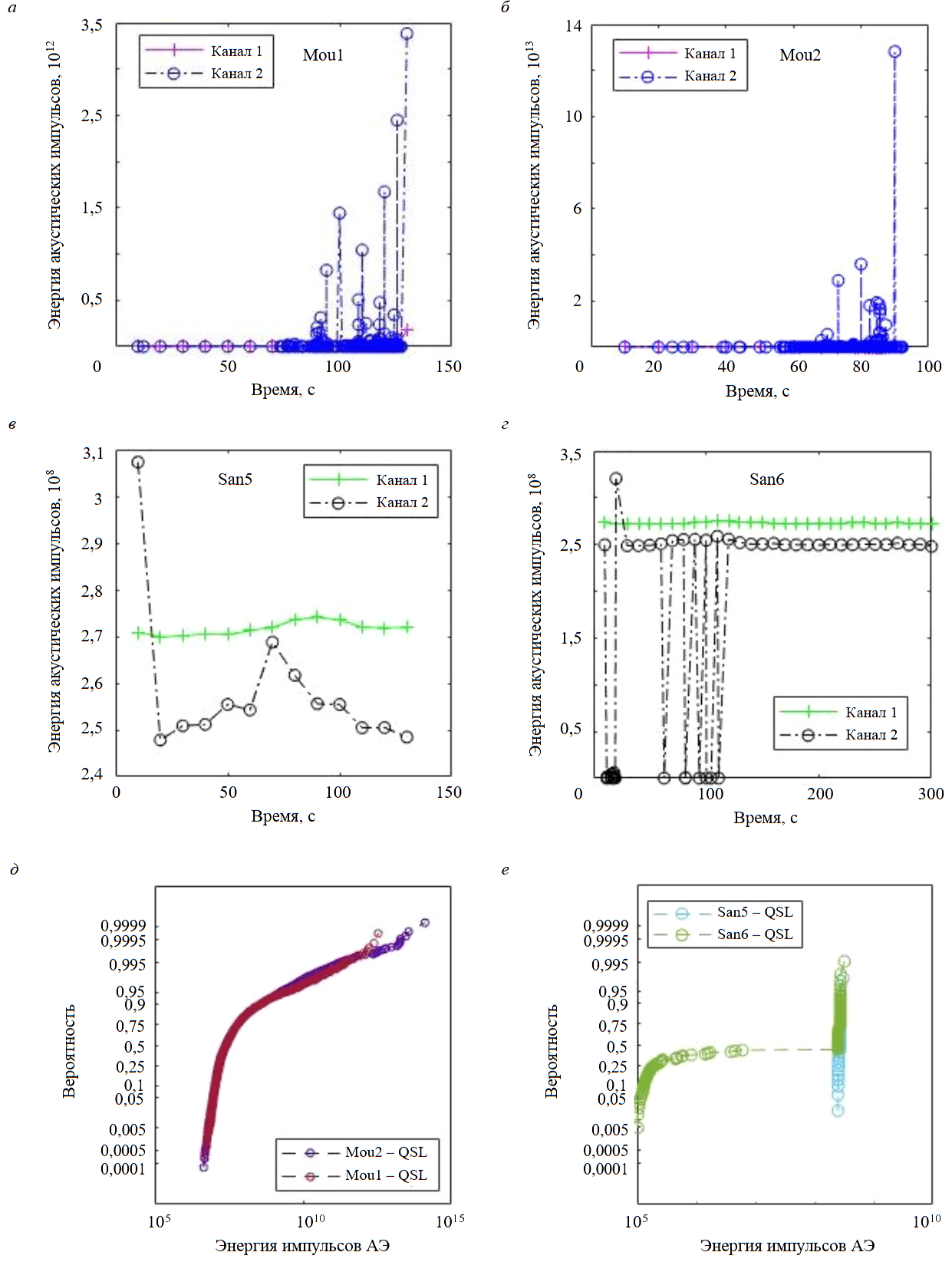 Рис.3. Сигналы энергии акустических импульсов с течением времени: для образцов андезита (а, б) и песчаника (в, г), а также вероятность распределения энергии импульсов при разрушении для андезита (д) и песчаника (е)