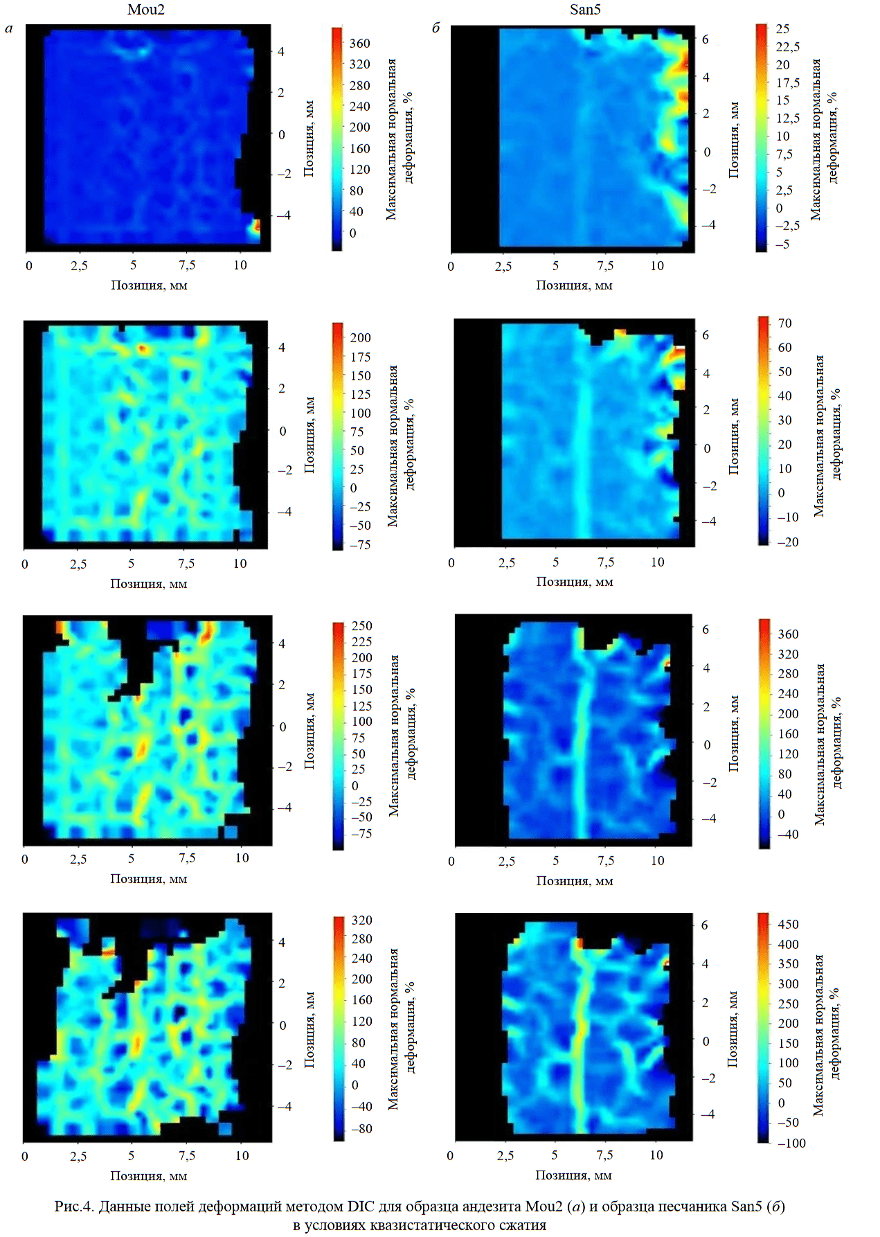 Рис.4. Данные полей деформаций методом DIC для образца андезита Mou2 (а) и образца песчаника San5 (б) в условиях квазистатического сжатия